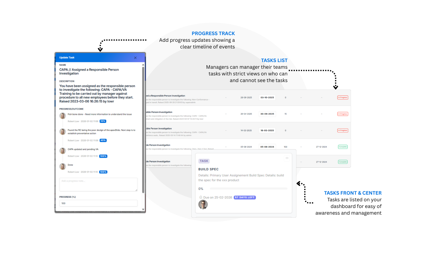 Tasks cannot be closed without evidence and appropriate approval, ensuring actions are effective and properly verified.